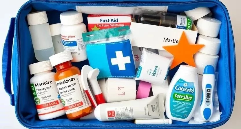 - Состав аптечки: Лекарства от жара, боли, аллергии, расстройства желудка, антисептики, пластыри и другие необходимые средства.