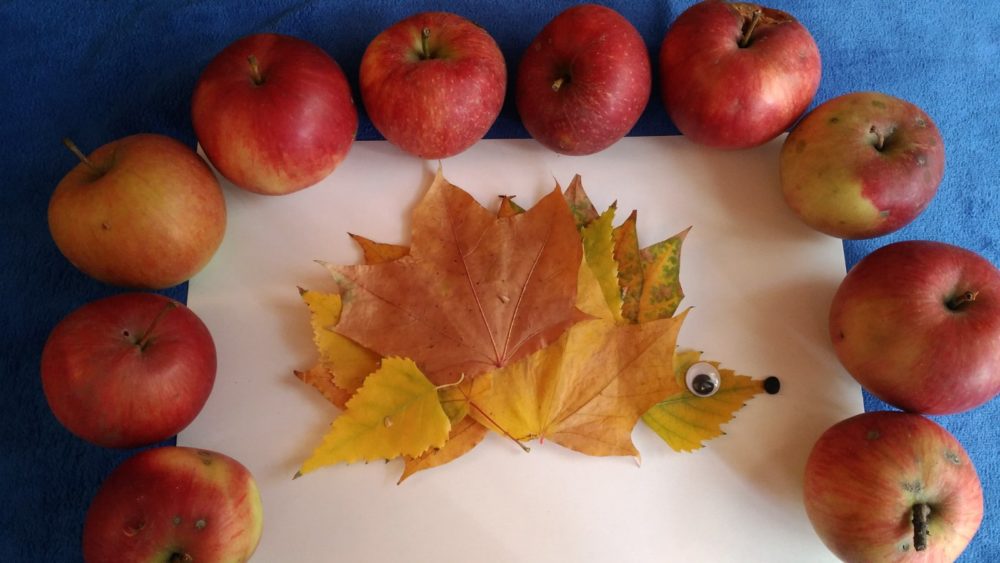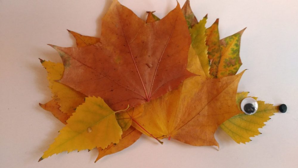 С обратной стороны от кончика носика приклейте к мордочке кленовую листву. Количество экземпляров может быть любым, зависит от размера аппликации. Главное – листья должны быть направлены резными концами вверх и в стороны, они не должны закрывать носик ежа, но могут перекрывать друг друга.