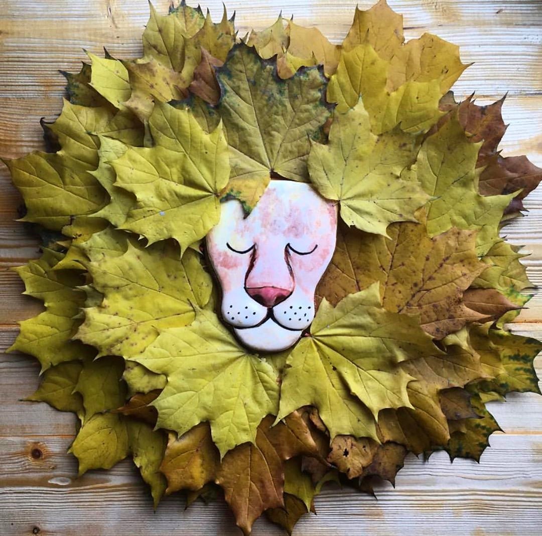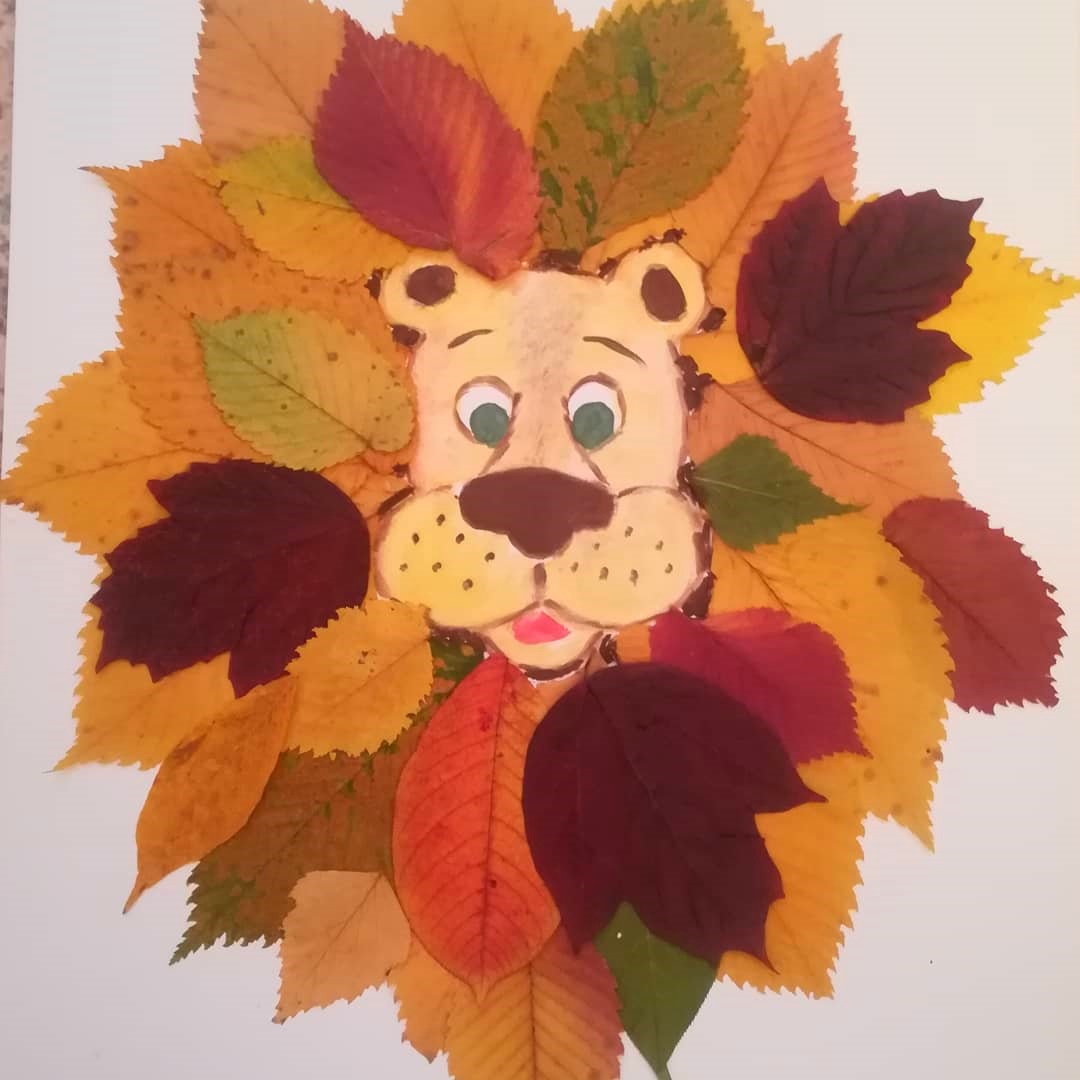 В центр кольца из листвы приклейте львиную морду. Уши наклейте чуть выше между листьями.