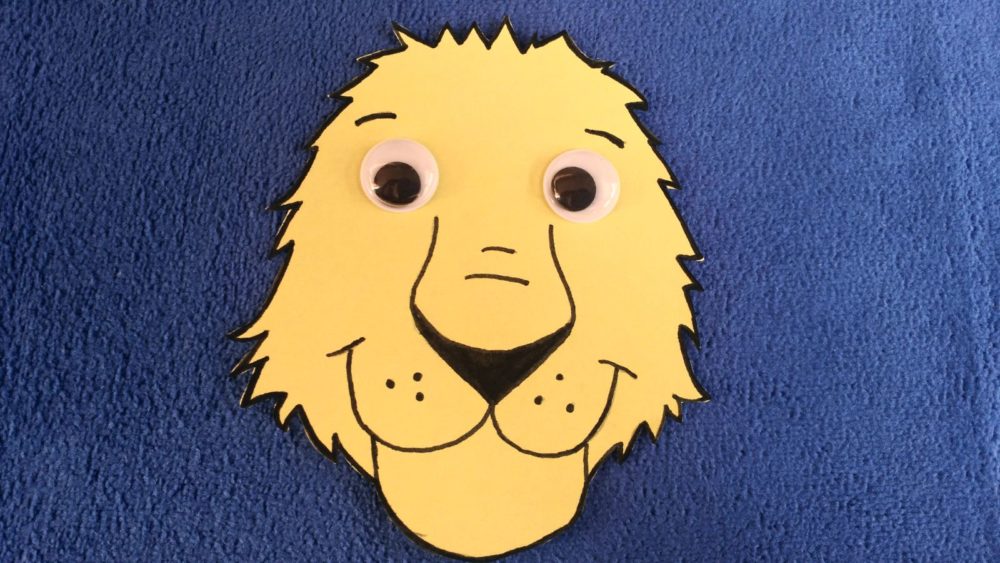 Нарисуйте на желтой бумаге конуры львиной морды. Черным фломастером подрисуйте нос, усы, пасть. Внутри рот закрасьте розовым фломастером. Вырежьте контур.