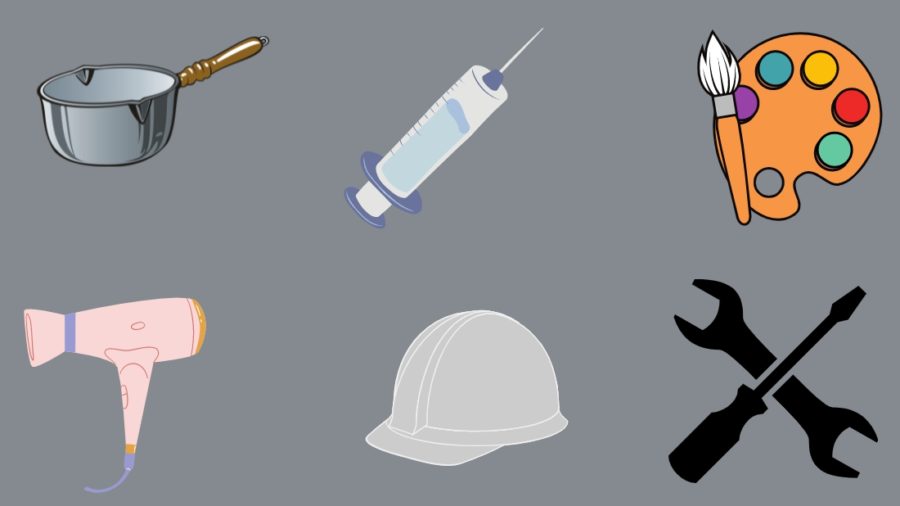 Воспитатель кладет перед детьми по 4 иллюстрации инструментов, которыми пользуются определенные работники. Один из предметов лишний, на него нужно указать с объяснением причины выбора. К примеру, «мастерок», «каска», «дрель», «шприц» – первыми тремя пользуется строитель, последним предметом – медсестра.
