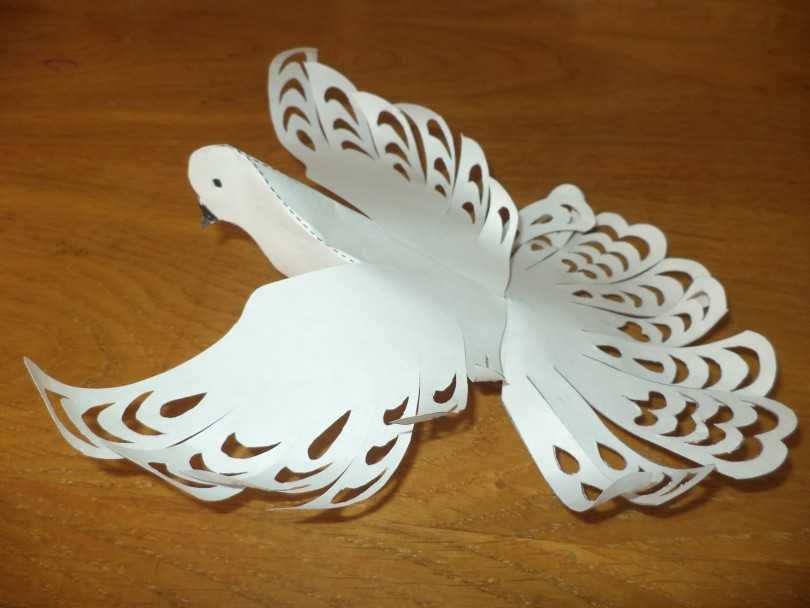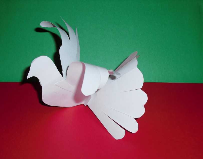 Затем необходимо из полученных шаблонов собрать основу голубя. Необходимо аккуратно проклеивать стыки и места соединения деталей. Этот этап займет не более 7 минут. После чего необходимо дать поделке какое-то время для того, чтобы она высохла. Как только это произойдет, нужно сделать надрезы на крыльях по шаблону, они будут имитировать перья. В целом, поделка готова. Остается один этап — декорирование, он абсолютно по желанию.