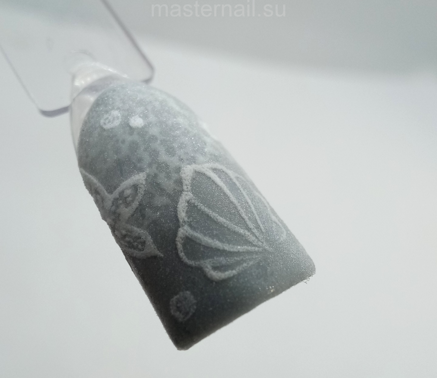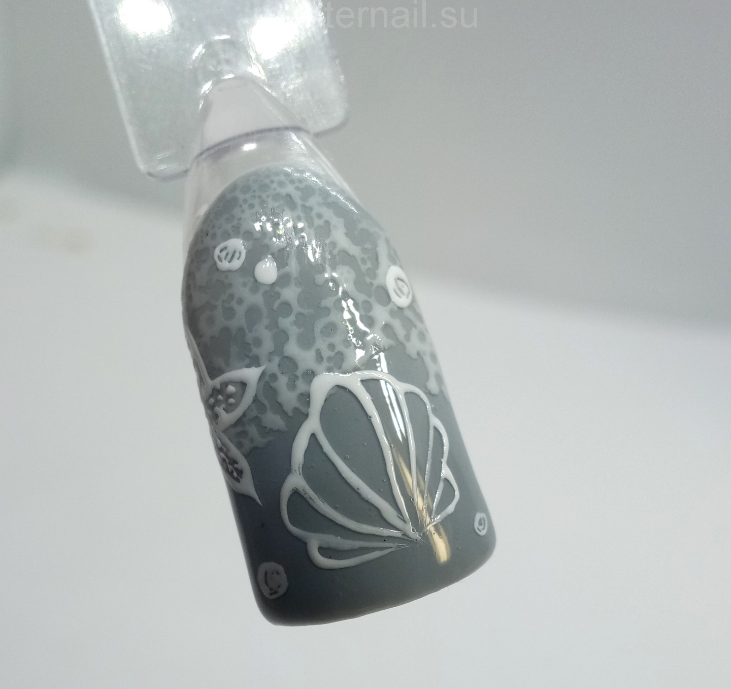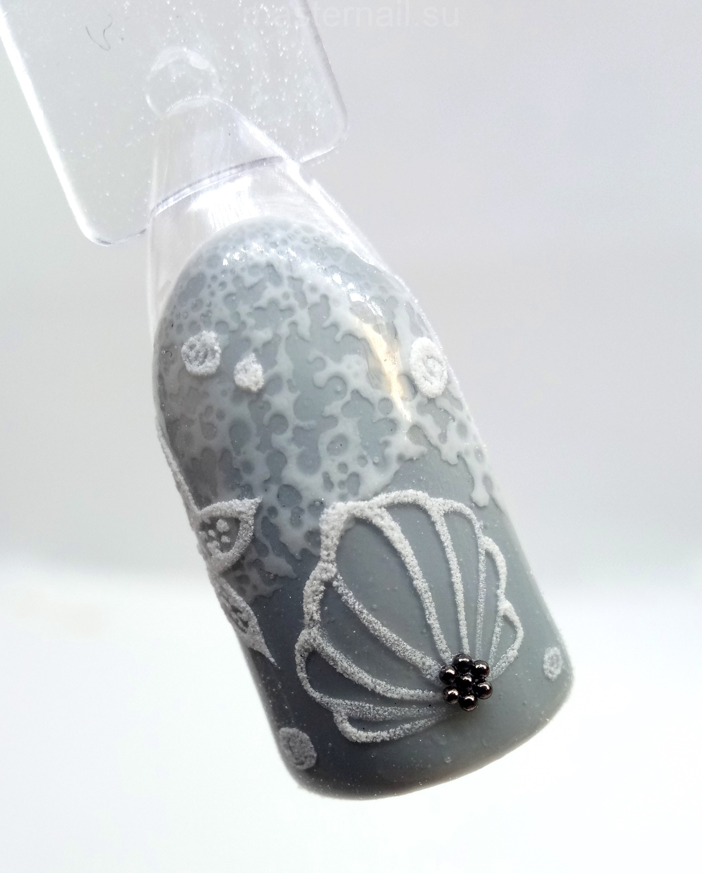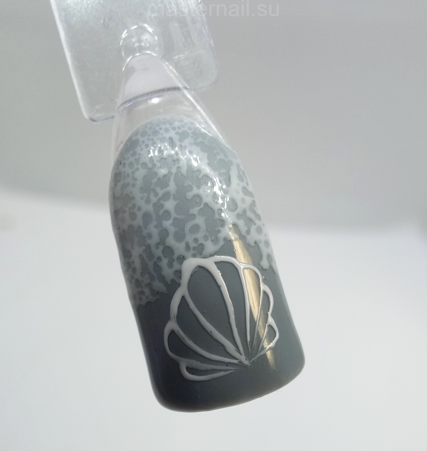 На следующем шаге белой гель-краской я нанесла рисунок в виде ракушки, чтобы была отсылка к морской тематике, присыпала его пудрой, отправила снова в лампу. Затем удалила остатки пудры кисточкой и пенный маникюр готов.