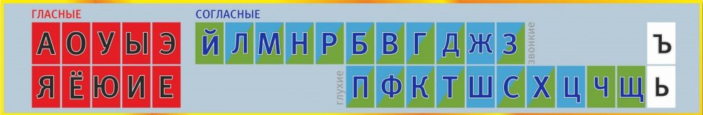 в начальной школе твёрдые согласные звуки обозначаются синим цветом, мягкие согласные звуки — зелёным цветом, гласные звуки — красным цветом.