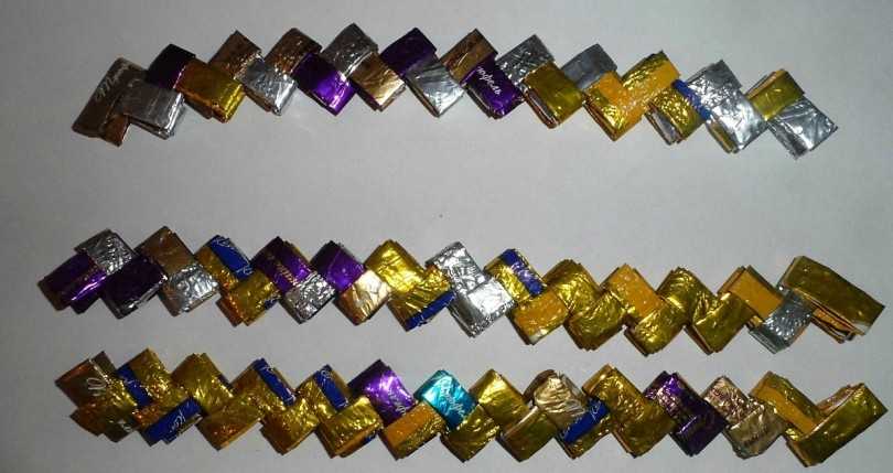 - Сперва из фантиков скручивают множество трубочек. Их нужно слегка прижать по центру, чтобы легче было продеть петлю из нитки.