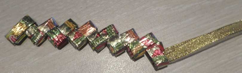 Невозможно себе представить Новый год без гирлянды. Для создания красивого декора понадобится сами фантики, швейная иголка и плотная нитка.