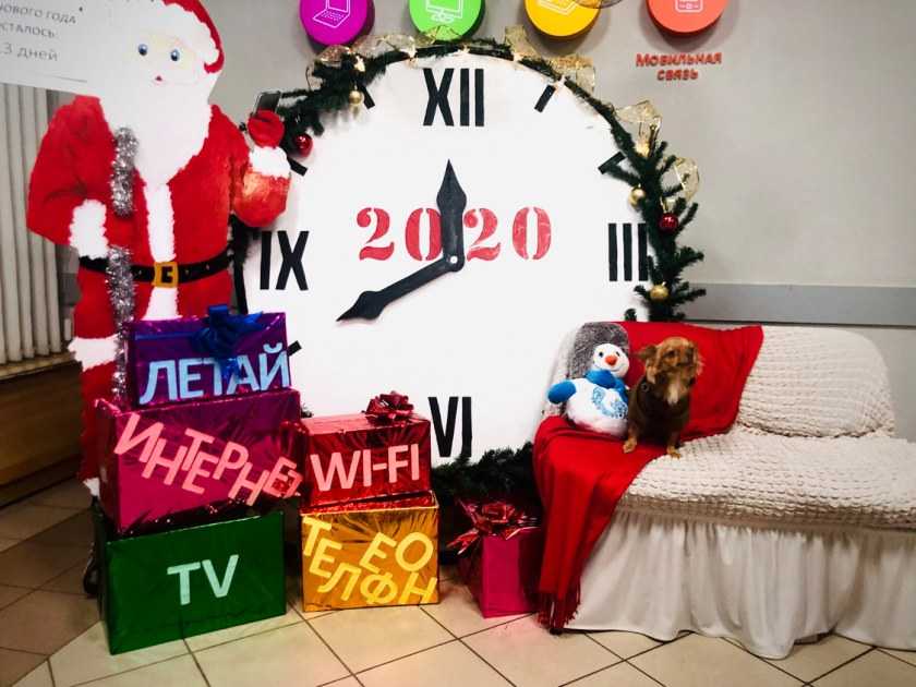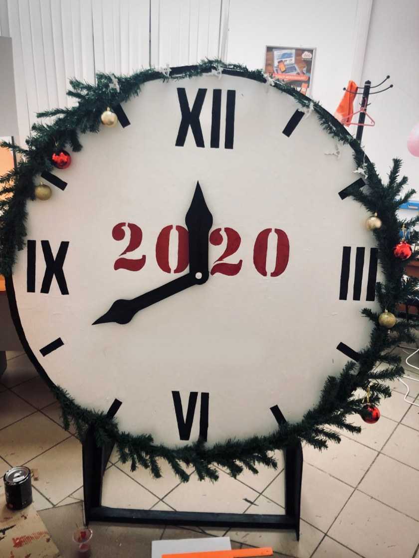 В большом помещении всегда есть окна. Их необходимо тоже украсить, используя для этого гирлянды, снежинки, елочные игрушки и подручные средства. Такая композиция с подсветкой будет особенно красиво смотреться в вечернее время как изнутри, так и снаружи.