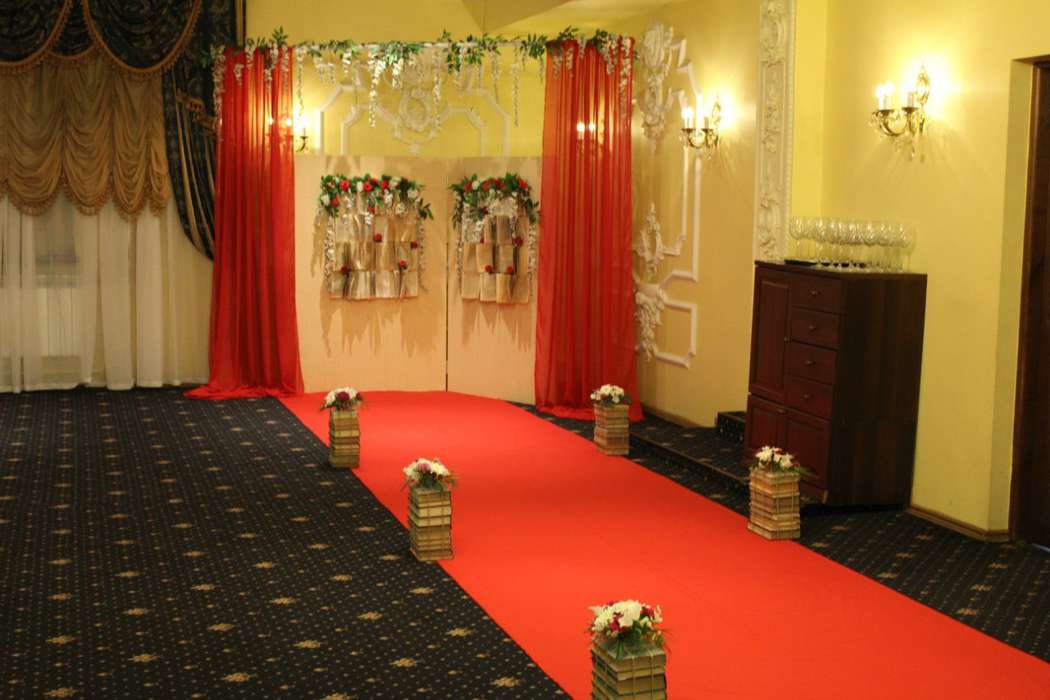 Очень тепло и атмосферно выглядит зал, оформленный в светлых пастельных тонах. Задрапированные текстилем стулья, напольные подсвечники, цветы делают обстановку изысканной и аристократичной.