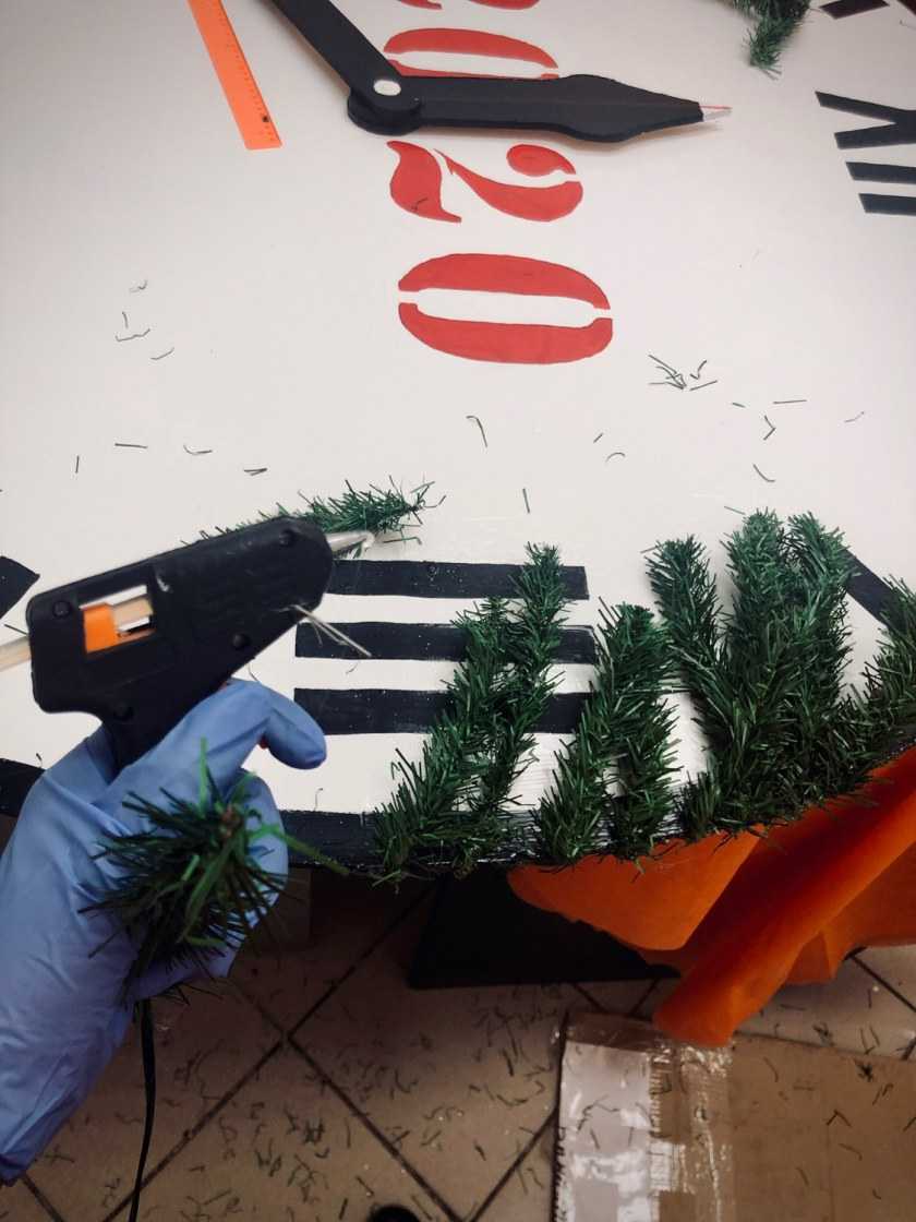 Фигурки можно вырезать из картона или бумаги. Маленькие стилизованные новогодние елки можно сделать из простого цветочного горшка, клубка зеленой пряжи, украшенного маленькими фигурными пуговками и блестками. Рядом с ними ставят свечи, подсвечники для которых могут быть сделаны из красивых прозрачных стаканов или кожуры апельсинов.