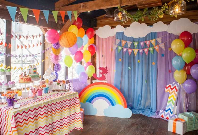 Радуга и фигуры из воздушных шаров смотрятся весело и ярко, символизируя настоящий праздник детства.