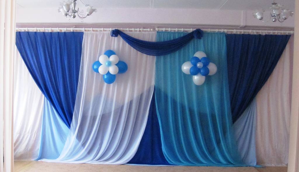 Используя текстиль в украшении интерьера, можно самый скромный зал превратить в роскошное место для проведения выпускного. Скрыть недостатки помещения, расширить границы, наполнить пространство воздухом.