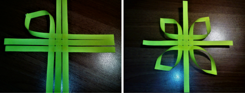 - Из листов цветной бумаги складываем гармошки. Всего понадобится 4 штуки. Уже сложенный элемент проглаживаем тупой стороной лезвий ножниц, сгибаем пополам. В середине проклеиваем, соединяем вкруг.