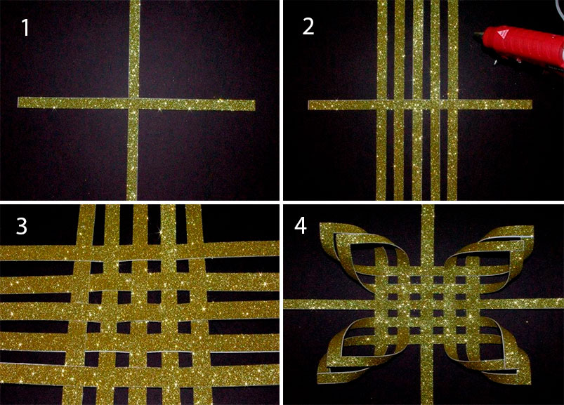 - Распределяем бумажные заготовки между ранее приклеенными элементами в количестве четырех штук.