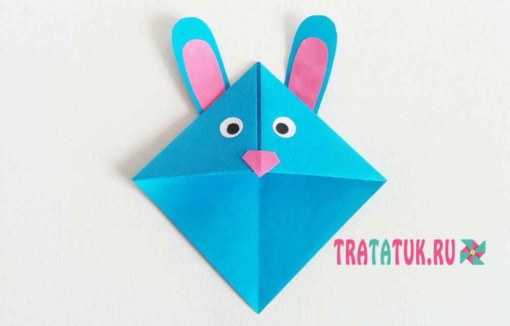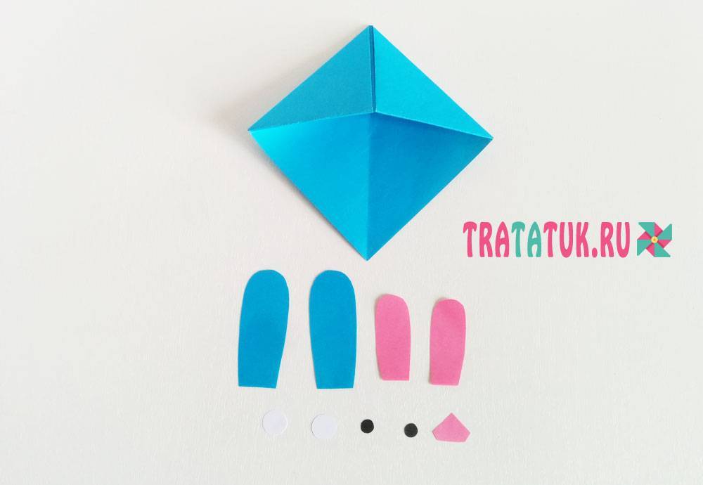 Заяц будет в пасхальных тонах, поэтому, по примеру сверху, сделайте уголок из голубой бумаги. Вырежьте из картона синие уши и немного меньшую их розовую копию, чтобы приклеить внутрь. Также вырежьте глазки, маленький треугольник со срезанными уголками – носик.