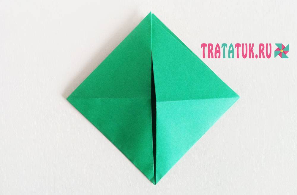 Вырезаем квадрат со сторонами 11 см. Сгибаем листок по диагонали. Раскладываем обратно и делаем то же самое с противоположной стороной. Переворачиваем лист и складываем пополам.