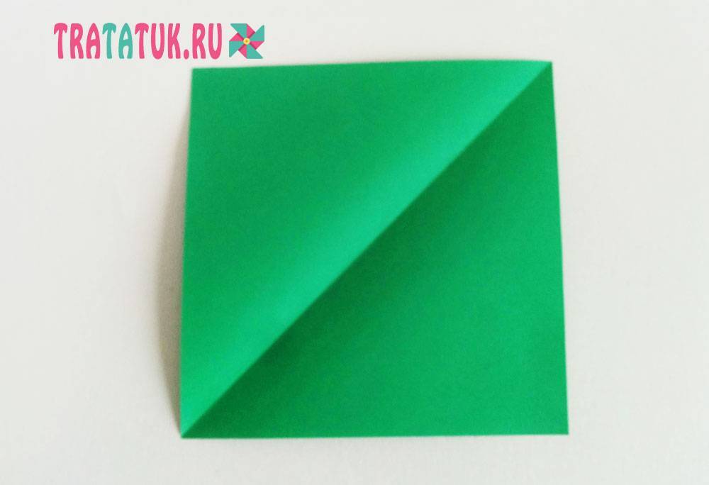 Вырезаем из бумаги квадрат со сторонами 15 см. Сгибаем одну диагональ. Складываем по второй диагонали, но не сгибаем. Оставляем только центральную отметку.