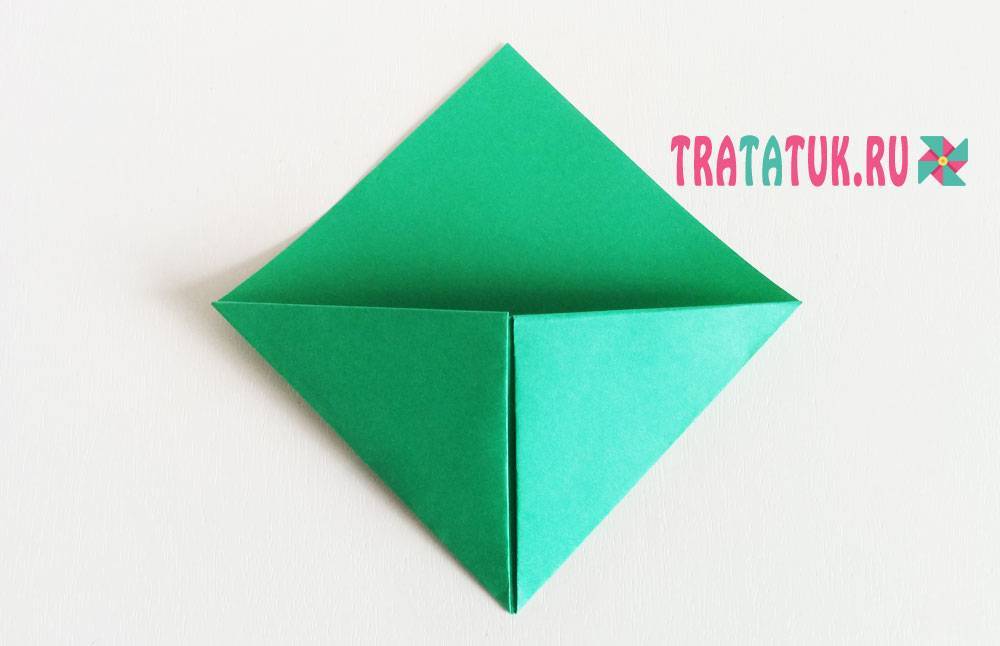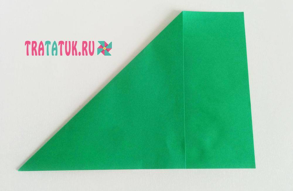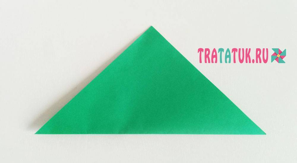 Сложите его вдвое, уголок к уголку, чтобы образовался треугольник. На фото сгиб снизу.