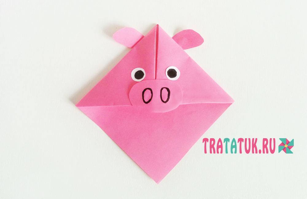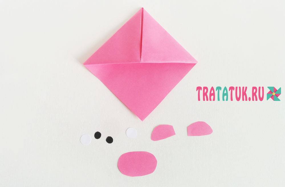 Уголок на этот раз понадобится розового цвета. Также нужно из картона вырезать ушки и пятачок. Из черной и белой бумаги – глаза.