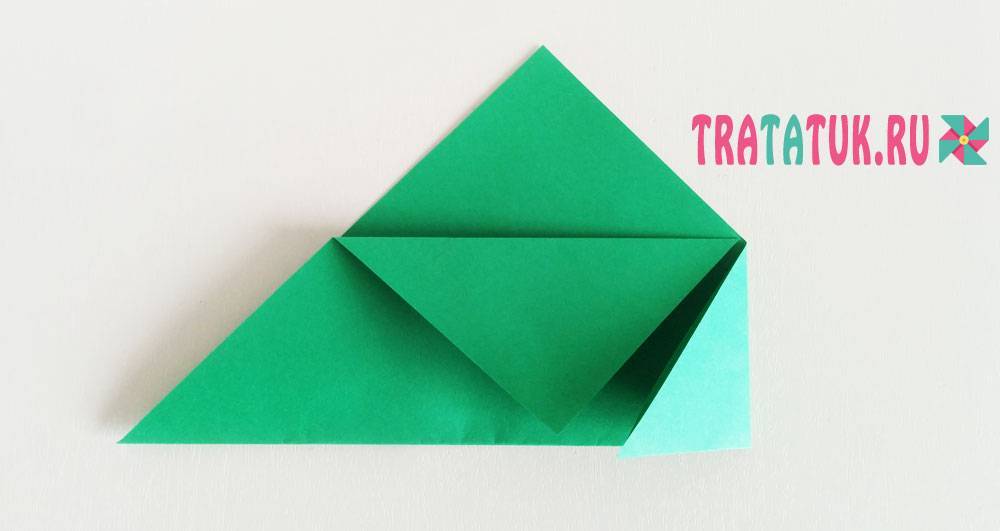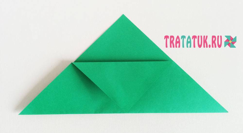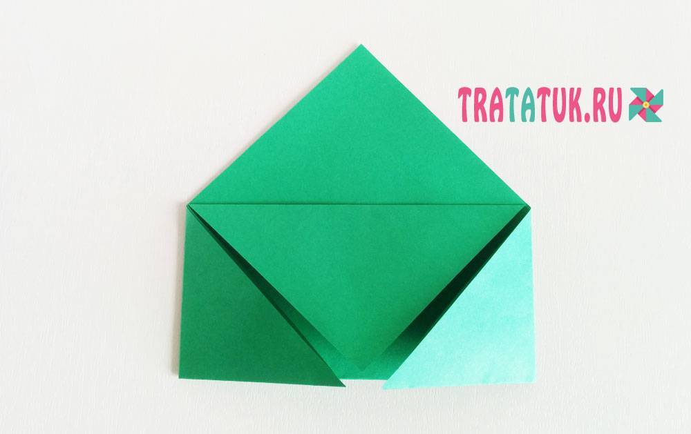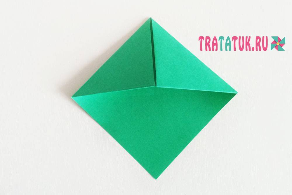 Тянем нижнюю сторону наверх, придерживая треугольник. Аккуратно сгибаем уголки внизу. Совмещаем линии сгибов с обеих сторон и проглаживаем согнутую часть заготовки. Отворачиваем верхнюю часть получившегося квадрата вниз.