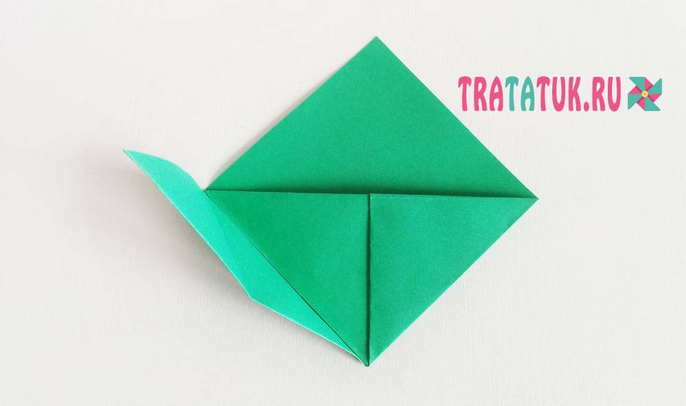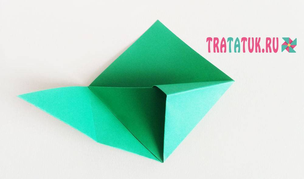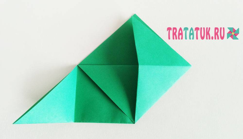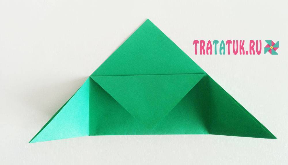 Складываем нижнюю сторону к центральной линии сгиба. Нажимаем на центр и точки пересечения линий сгиба, чтобы уголки вывернулись в обратную сторону. Складываем за боковые стороны треугольник по сгибам.