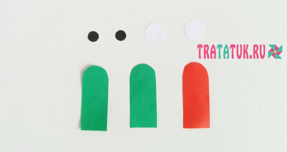 Вырезаем из зеленого картона две полосы и одну с красного, закругляем на одной из сторон уголки. Вырезаем глаза и зрачки.