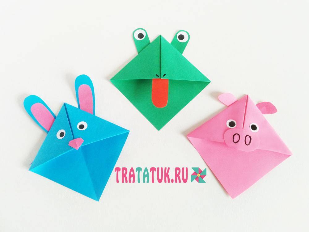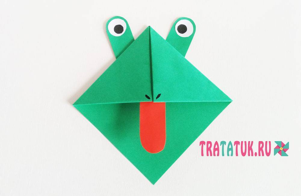 Как сделать закладку из бумаги – производится по той же технике. Необходимо сформировать квадрат, далее сложить его так, чтобы получился треугольник. Основа склеивается, формируется кармашек. Достаточно вырезать дополнительные элементы в виде больших глаз и лап, приклеить все к основе. Для выделения отличительных особенностей – дополнительно вырезается язычок из красной или розовой бумаги.