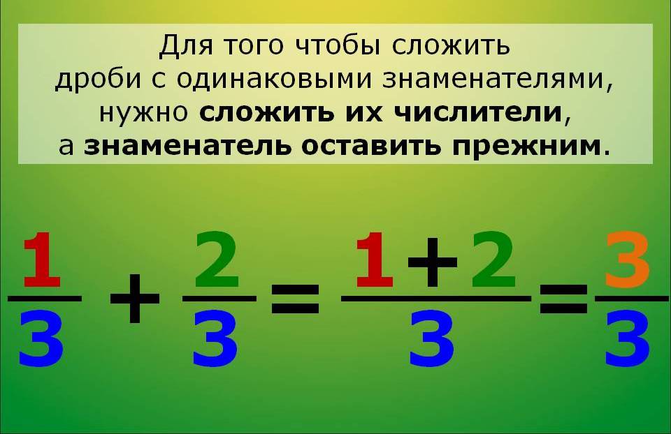 - Когда необходимо произвести вычитание дробей с одинаковыми знаменателями, то в процессе решения суммируется только числитель дробей.\Где:\ и равные некоторым числовым значениям.