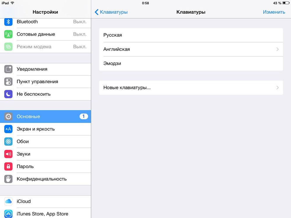 - Для установки новых пакетов нажимаем на пункт «Клавиатуры». Как видите, у вас стоит только один. Выбираем пункт «Новые клавиатуры», с помощью которого вы и можете добавить, например, английский. Кстати, тут же вы можете включить смайлики emoji. Для этого просто выберите в списке язык «Эмодзи». На этом всё.