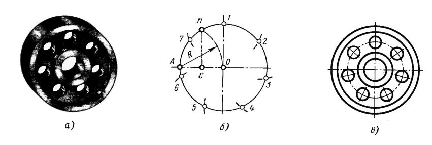 На рис. 58, а изображен шкив, а на рис. 58, в — чертеж шкива, где окружность разделена на семь равных частей.