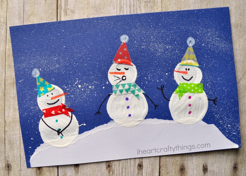 А вот и еще идея поделки для самых маленьких. Снеговики в этом случае нарисованы с помощью пробок от пластиковых бутылок. Нужны две пробки разных размеров (побольше и поменьше). Намазываете из белой краской и делаете отпечаток. Лицо, ручки и пуговки дорисовываете фломастерами, когда краска полностью высохнет. А шапку и шарфик можно сделать из цветного скотча, цветной бумаги или фетра, например.