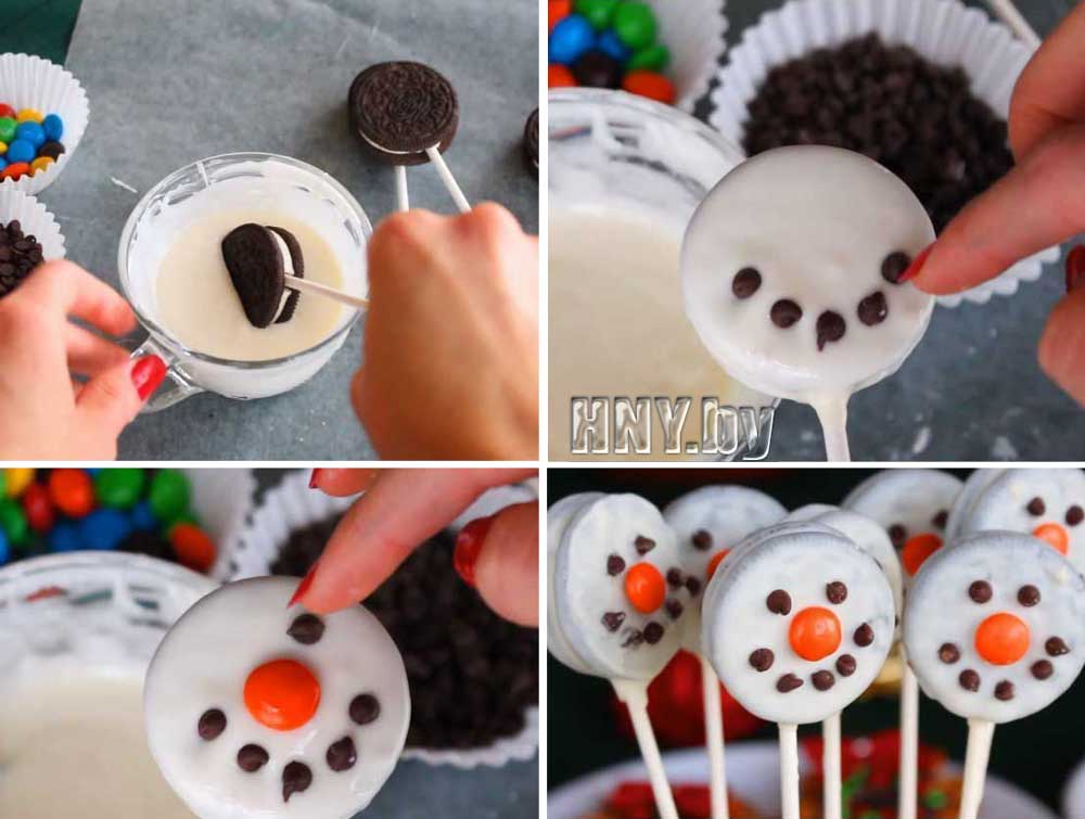 А вот снеговики на палочке. Для приготовления Вам понадобится печенье-сэндвич, белый шоколад, шоколадная крошка и красные круглые конфетки. Печенье насадите на палочку и обмакните в шоколаде. Сразу же декорируйте шоколадной крошкой и красной конфетой и отправьте «обсыхать». Сохнуть можно положить на пергамент, шоколад не прилипнет и не сотрется.