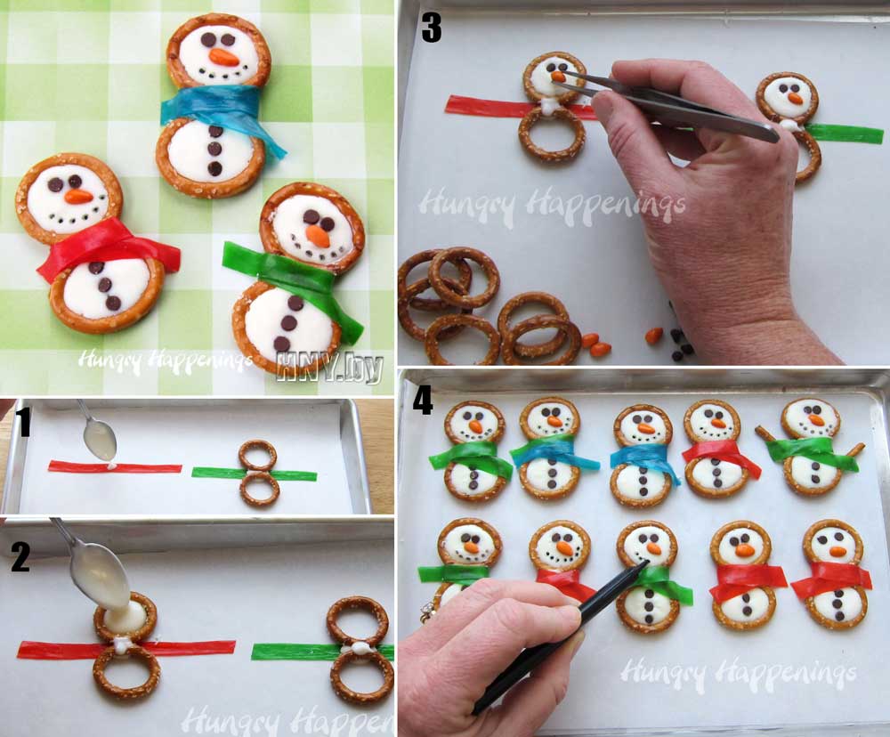 Необычное лакомство ожидает гостей из соленых колечек и белого шоколада. Вам понадобится: жевательная тянучка, колечка, шоколад (белый и темный). Тянучку положите на пергамент и в центр капните немного растопленного шоколада. Затем в это место положите колечки и закрепите шоколадом еще раз. Сами колечки заполните шоколадом и декорируйте шоколадной крошкой (глазки, нос, рот, пуговицы). Дождитесь пока шоколад застынет и заверните шарф тянучку. Угощенья очень легко снимутся с пергамента. Осталось только выложить снеговиков на тарелку!