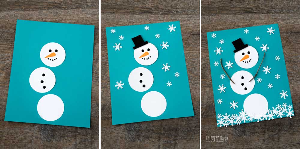 Вот еще один вариант простой поделки в технике аппликация. Снеговик смотрит не прямо, а вверх, что добавляет поделке волшебства и реальности.