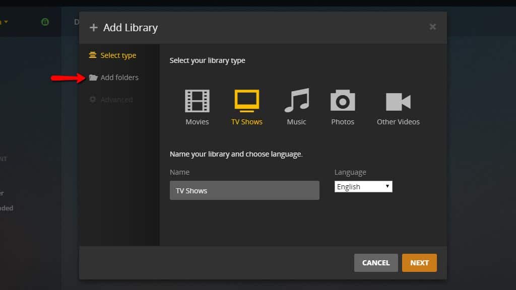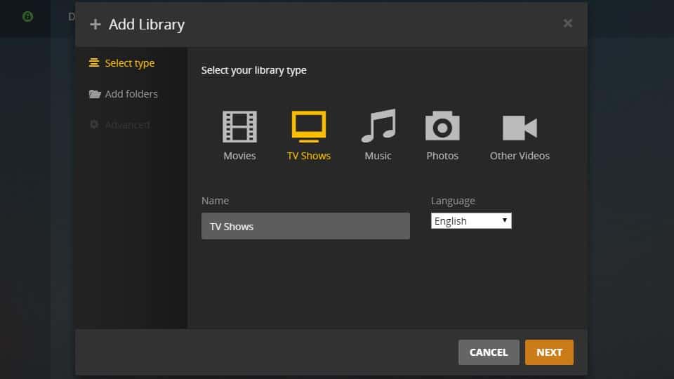 Select the type of library you’re adding. In our case, we’re setting up a library for TV Shows, so highlight it.