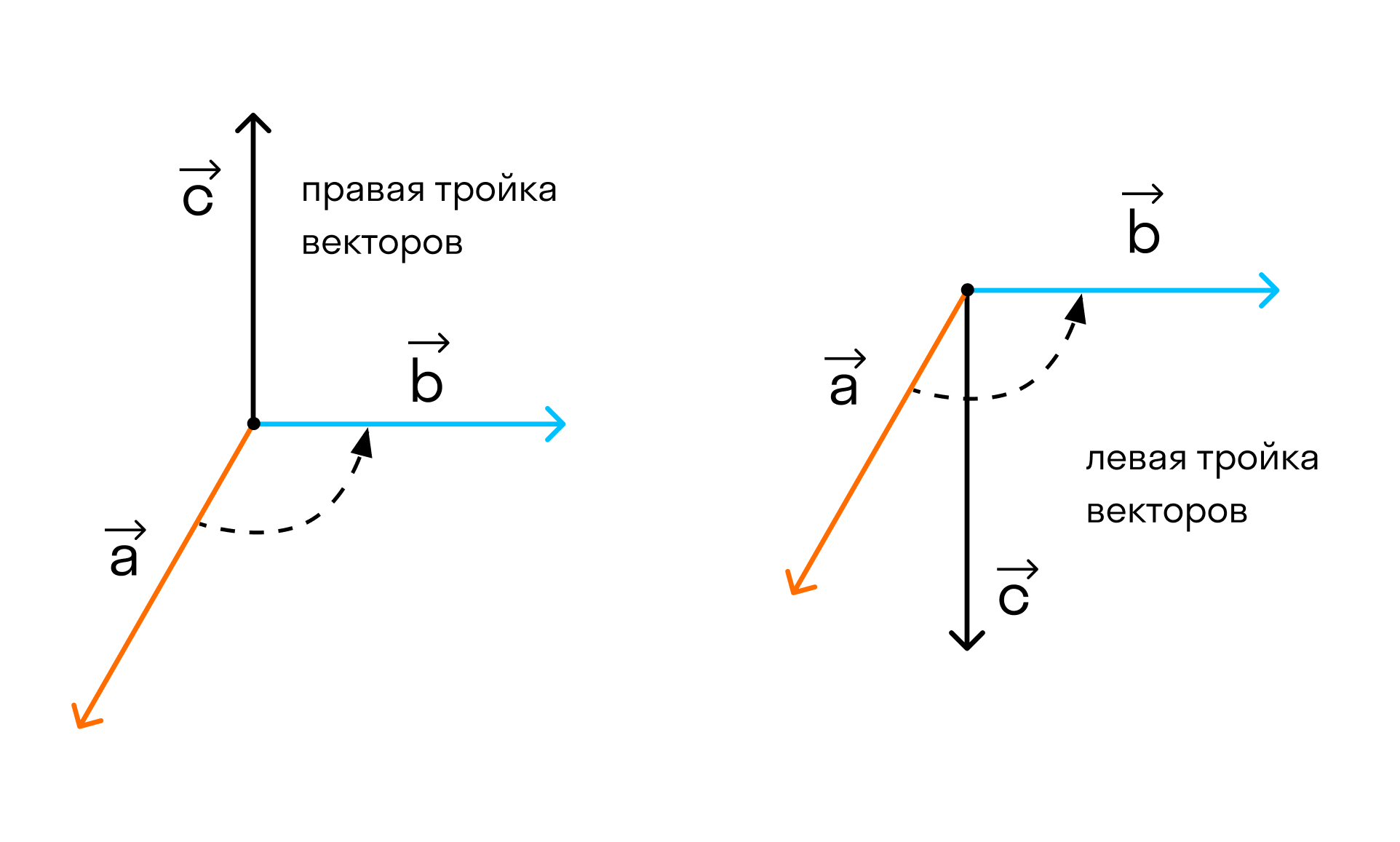 Посмотрим с конца вектора →c на то, как происходит кратчайший поворот от вектора →a к →b. Если кратчайший поворот происходит против часовой стрелки, то тройка векторов →a, →b, →c называется правой, по часовой стрелке — левой.