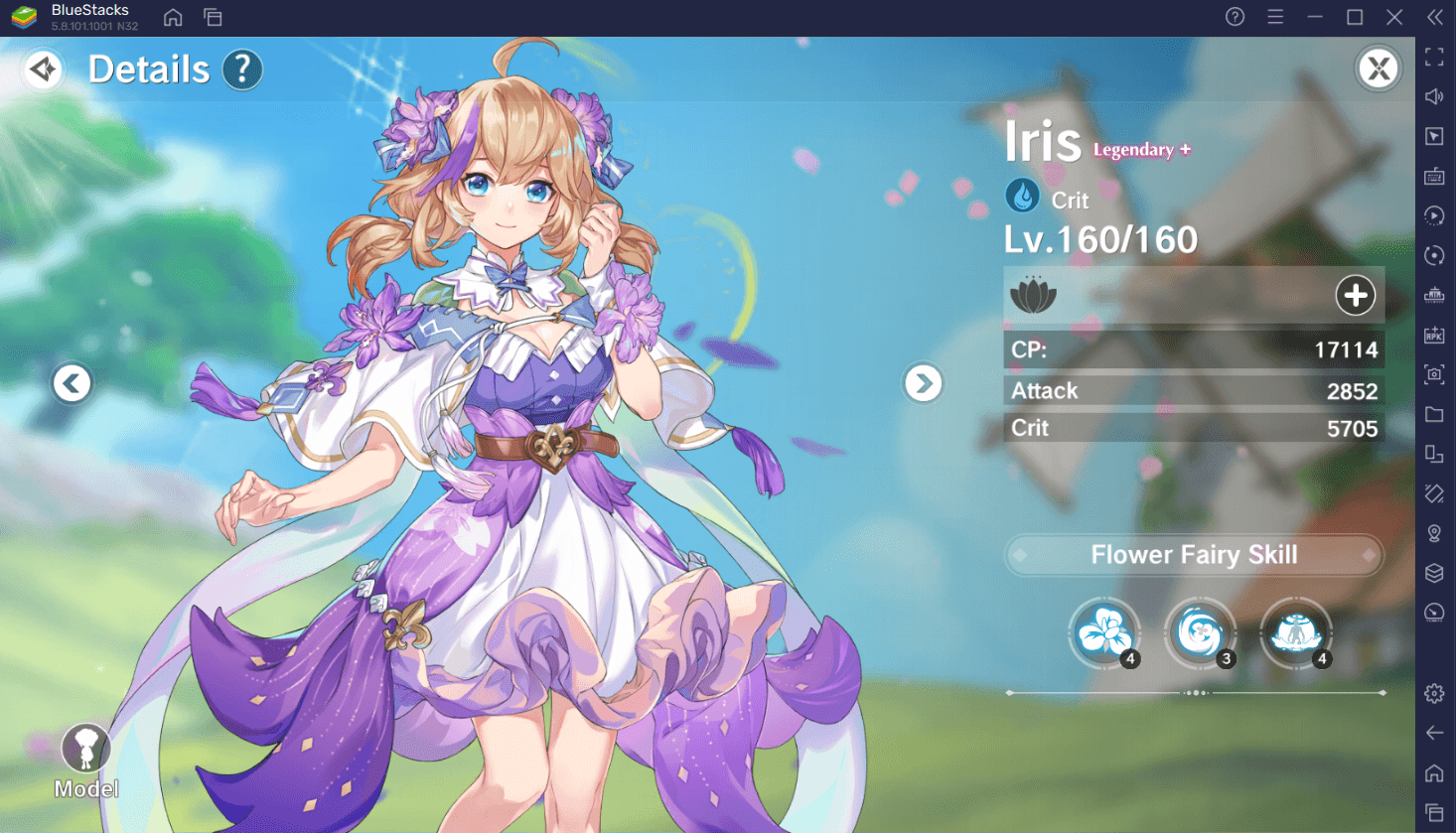 Цветочная фея категории Superb и особой, священной стихии (Sacred). Специализируется на контроле и уроне по множеству врагов. Активная способность 1: следует за вами, наносит 75% + 3000 от вашего урона по области. Активная способность 2: снаряд, наносящий 82% + 160 от вашего урона по области (наносит урон 6 раз, цель оглушается на 4 секунды). Пассивная способность: урон всех фей (видимо, союзных) повышается на 8%.