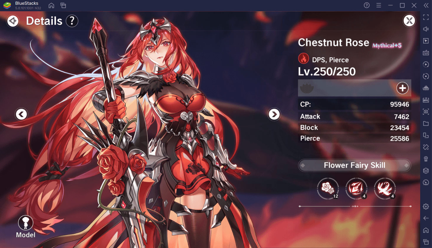 Цветочная фея категории Superb и стихии огня. Специализируется на пробивании брони. Активная способность 1: фея следует за игроком и наносит 60% + 3000% от вашего урона по области. Активная способность 2: огненный феникс, наносящий всем врагам на своем пути 315% + 4900% от вашего урона (после чего урон от огня увеличен на 20%). Пассивная способность: когда вы активируете огненную стихию, у феи увеличивается пробивающий урон.