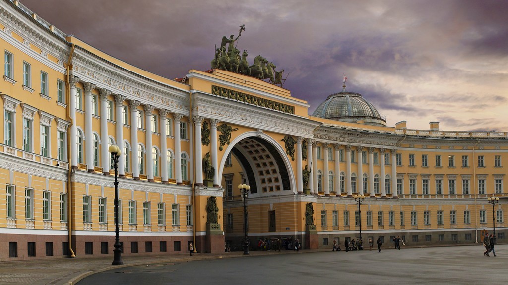 Если Зимний дворец поражает воображение архитектурой и интерьерами, то здание Главного штаба — длиной. Протяженность фасадов составляет 580 метров! На строительство Главного штаба ушло 10 лет. Когда-то его помещения занимала милиция, сейчас же одна часть здания принадлежит Эрмитажу, а другая — Западному военному округу.