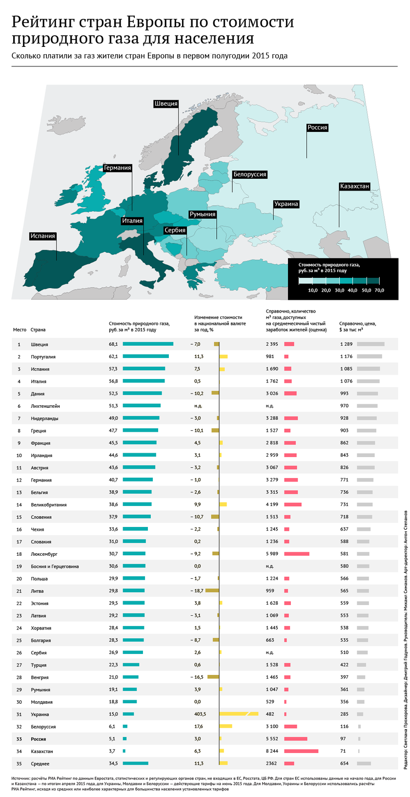Конечные цены на голубое топливо, по которым его оплачивает население в различных государствах Европы, различаются радикально, а динамика этих цен в последний год слабо коррелировала с динамикой цен на мировом газовом рынке. Об этом свидетельствует рейтинг стран Европы по ценам на природный газ для населения в I полугодии 2015 года, подготовленный экспертами РИА Рейтинг.