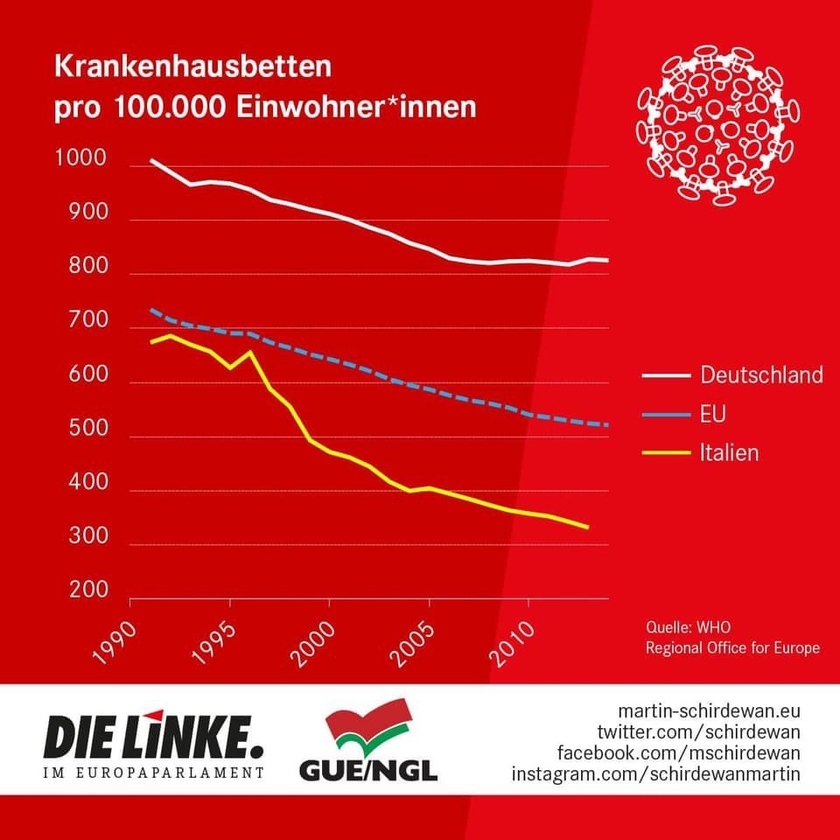 Количество больничных коек в Германии , Италии и в ЕС в целом в расчёте на 100 000 жителей с 1990 по 2019 год. Кризис коронавируса COVID-19 в Европе — это результат оптимизации медицины.