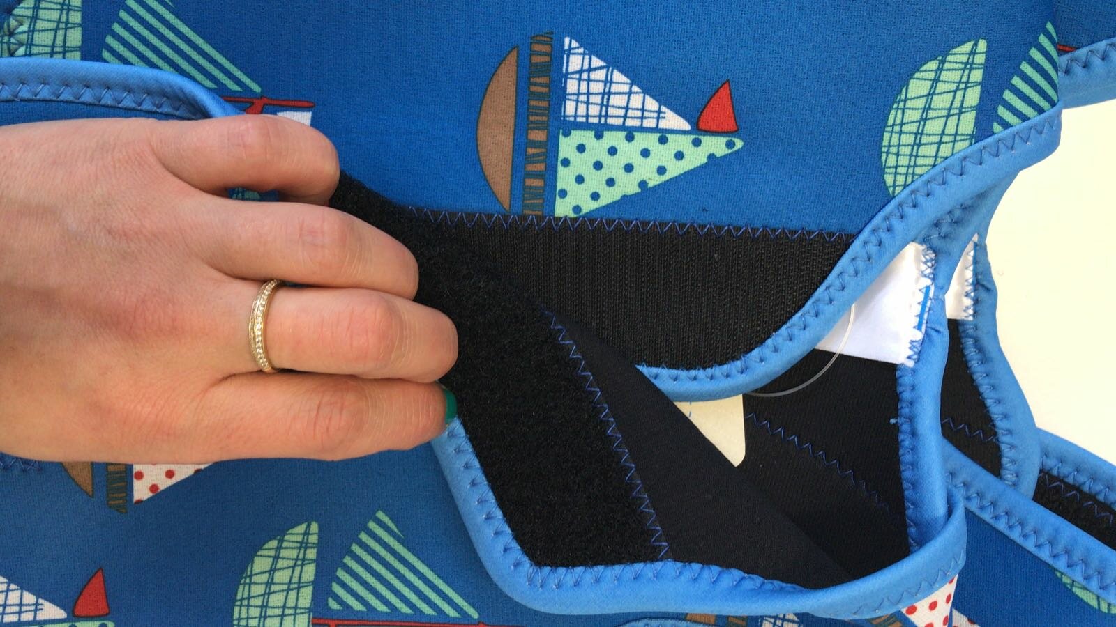 На гидрокостюмах-обертышах липучки по всему костюму. Центральные липучки позволяют регулировать по ширине, а липучки на плечах — по росту ребенка