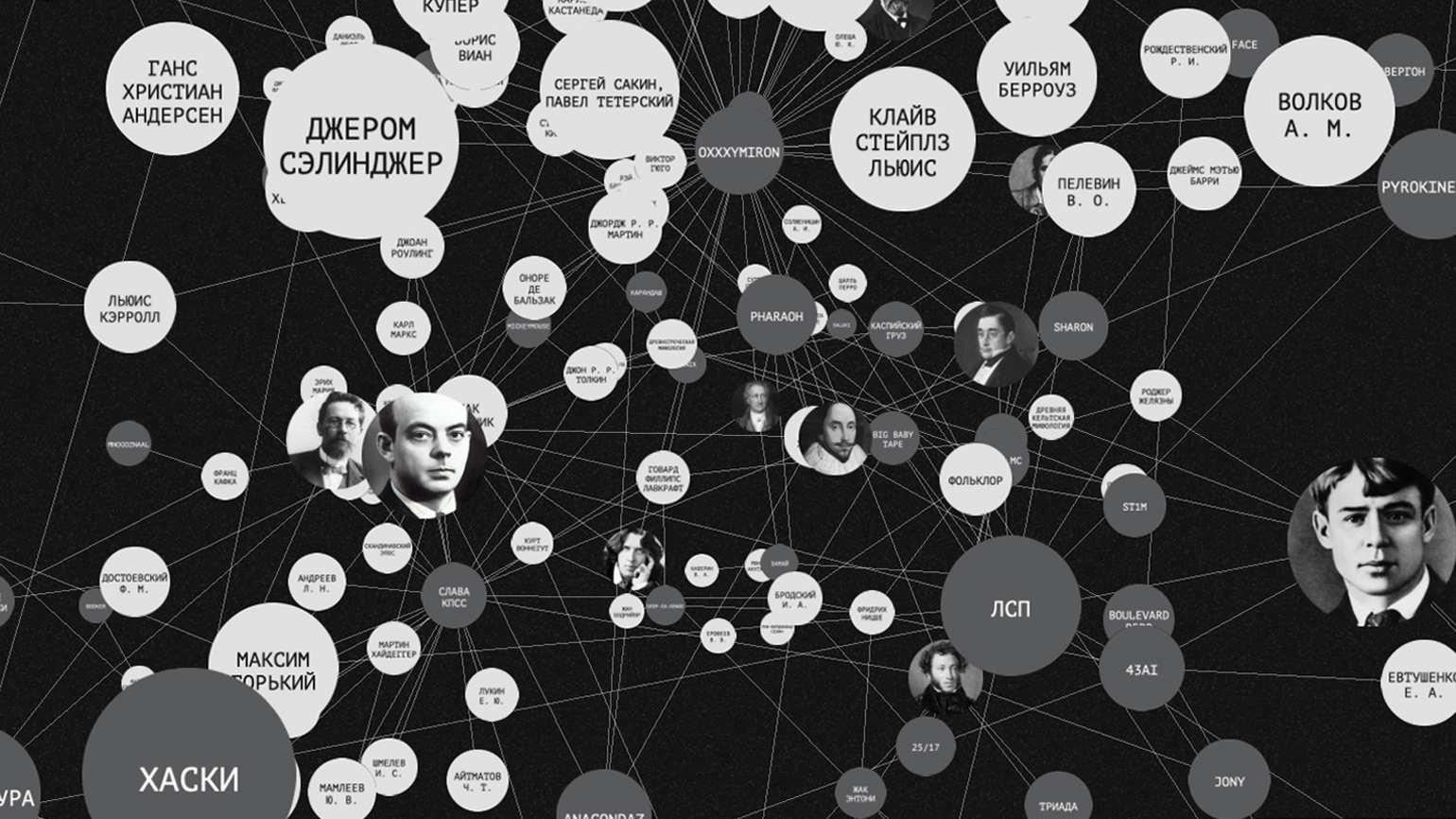 Изучать карту можно, как разглядывая и вращая виртуальную «сцену», отображающую культурные переплетения, так и с помощью поиска: по имени интересующего писателя или рэп-музыканта.