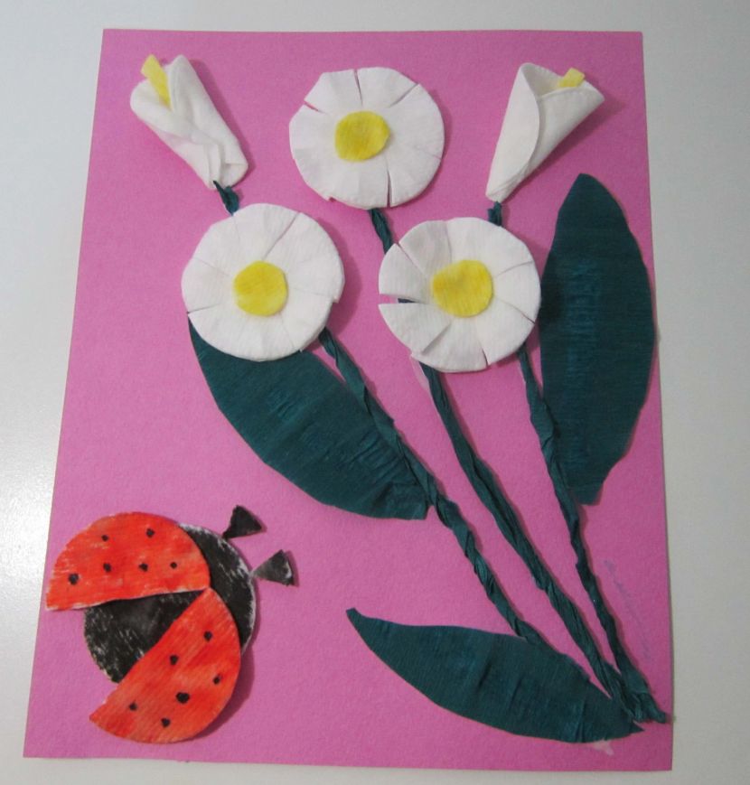 Эти нежные, простые, но очень милые цветочки так же легко сотворить из ватных дисков. Стебель, чашечку и листочки делаем из зеленой плотной бумаги. Цветочек изготавливается разными методами. Для самой простой ромашки нужен один ватный диск, который надрезается по кругу, а серединка просто раскрашивается желтой краской.