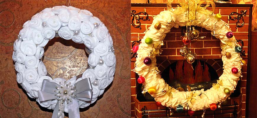 Далее знакомлю вас с новогодними венками. Цветы для их украшения выполнены на основе спирали. Как изготовить такой венок видно на примере красного цветка.