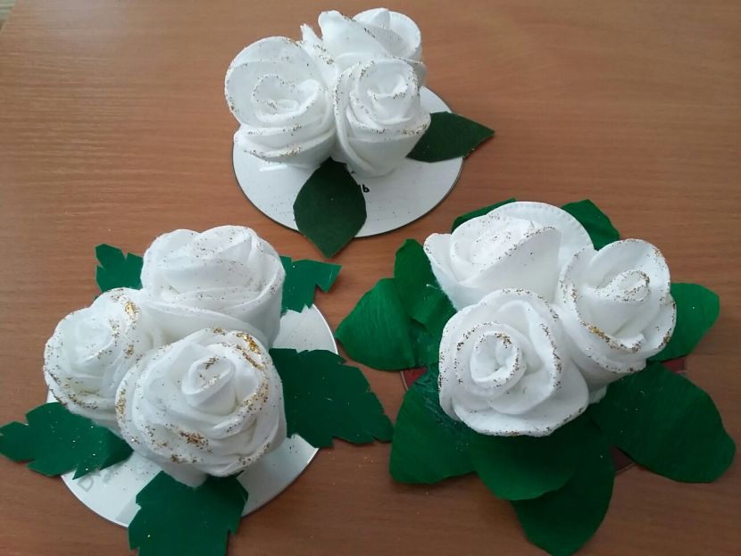 - Элементы на венок можно сделать так: собрать первый диск в форме кулечка, прикрепить к нему второй и третий. Таким способом вы сможете сделать розы своими руками из ватных дисков.
