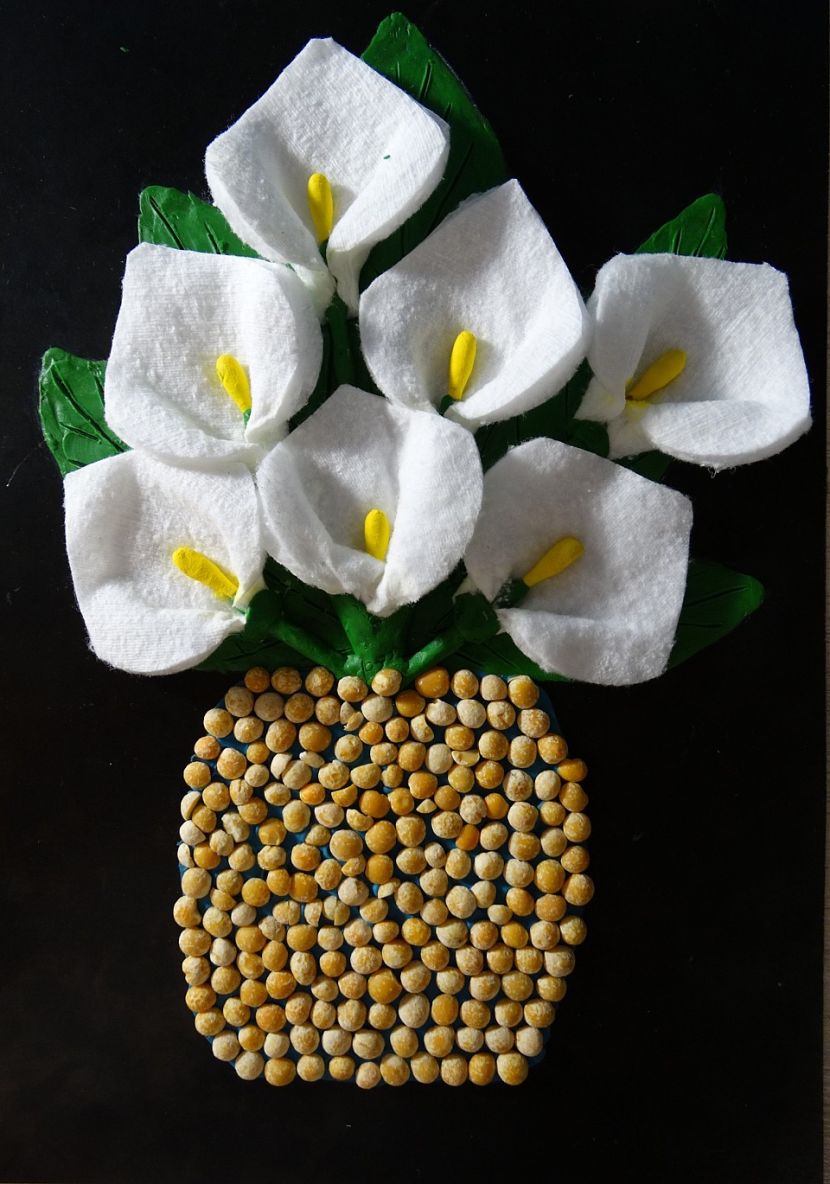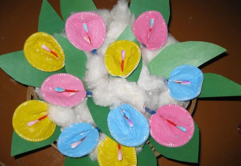 Экстравагантные, строгие, лаконичные каллы, состоящие из одного изогнутого лепестка достаточно просто выполнить из ватных дисков. Для изготовления серединки вам понадобится половинка ватной палочки, верхняя часть которой окрашивается в желтый цвет. Одной частью ватного диска зажимается серединка и заклеивается. Получившийся цветок крепится на стебелек из бумаги или из трубочки для коктейля.