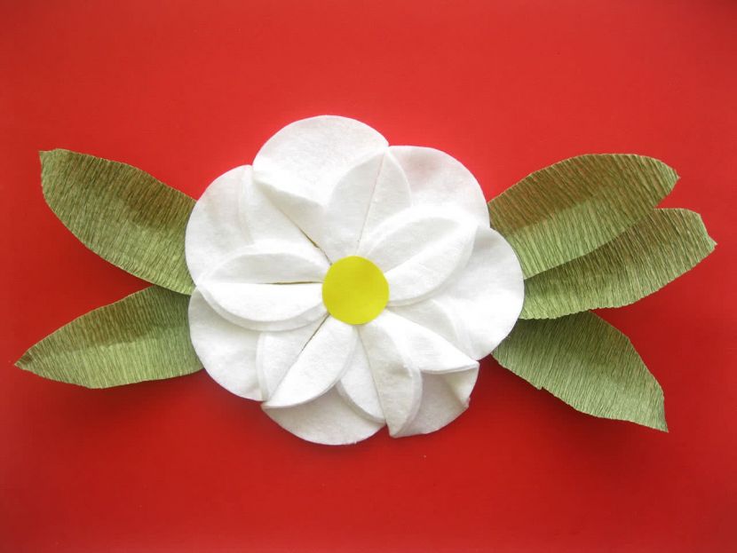Для цветочка поинтересней используют 5 или более дисков – лепестков, наклеенных на круглую картонную основу, или на держатель для воздушного шарика. В качестве серединки можно взять вырезанный из бумаги, или фетра яркий кружок. Еще один вариант лепесточков для ромашки, когда края загибаются внутрь и приклеиваются, таким образом цветочек получается более объемным.