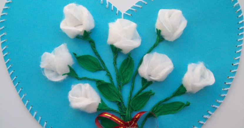 Красивую розочку из ватных дисков может собрать даже маленький ребенок, несмотря на простоту изготовления, внешний вид изделия порадует своей привлекательностью. Для изготовления серединки цветка, сложенный пополам ватный диск скручиваем в рулончик и склеиваем. Затем склеенными половинками оборачиваем сердцевину, формируя лепестки. Чем больше лепестков вы приклеите, тем объемней получится ваша роза.