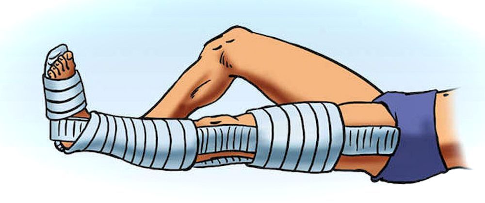 Не всегда на месте травмы можно найти медицинскую шину. В этом случае используют подручные средства или фиксируют больную ногу, прибинтовывая ее к здоровой. Главная цель при оказании первой помощи – обездвижить все суставы, чтобы не усугублять степень травмы.