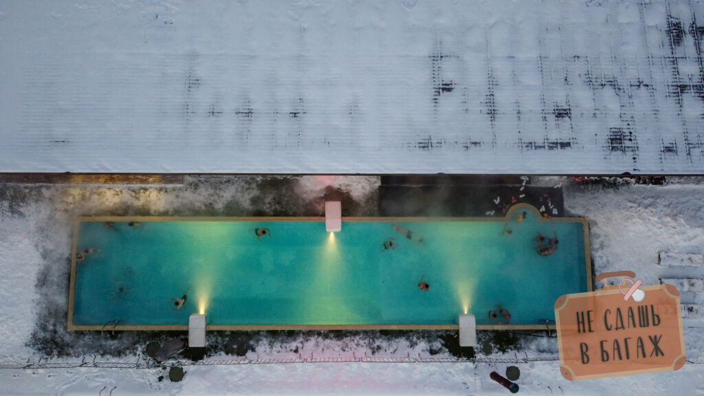Кроме большого бассейна, есть две горячие купели (+38 °C). А для детей предусмотрена отдельная зона — с глубиной бассейна до 40 см.